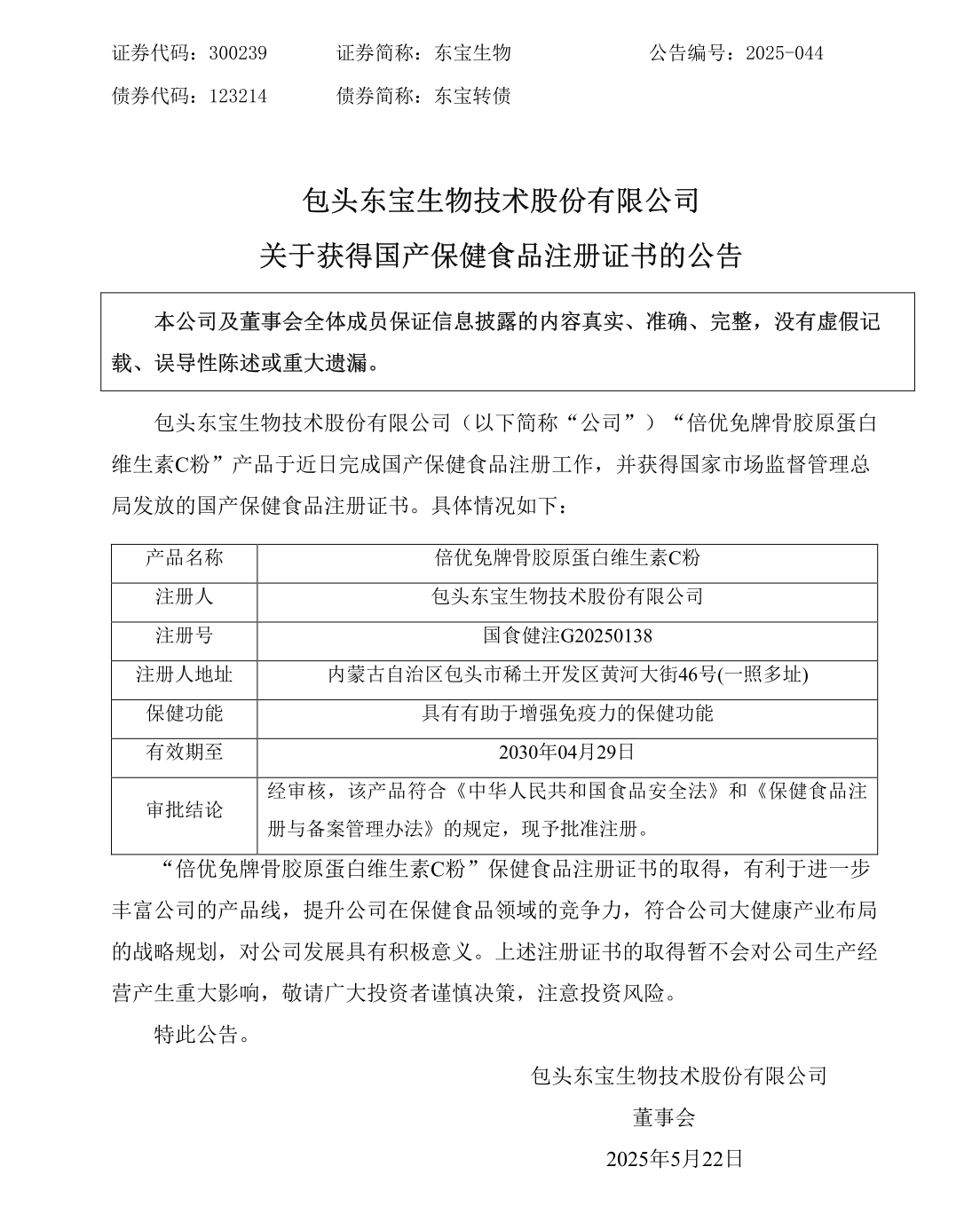 5月22日,東寶生物(證券代碼:300239)發(fā)布公告,近日公司完成了“倍優(yōu)免牌骨膠原蛋白維生素C粉”產(chǎn)品的國產(chǎn)保健食品注冊工作,并獲得了國家市場監(jiān)督管理總局發(fā)放的注冊證書,注冊號為國食健注G20250138。該產(chǎn)品具有增強(qiáng)免疫力的保健功能,有效期至2030年4月29日。公司表示,此次注冊證書的取得有利于進(jìn)一步豐富公司的產(chǎn)品線,提升在保健食品領(lǐng)域的競爭力,符合公司在大健康產(chǎn)業(yè)布局的戰(zhàn)略規(guī)劃,對公司發(fā)展具有積極意義。