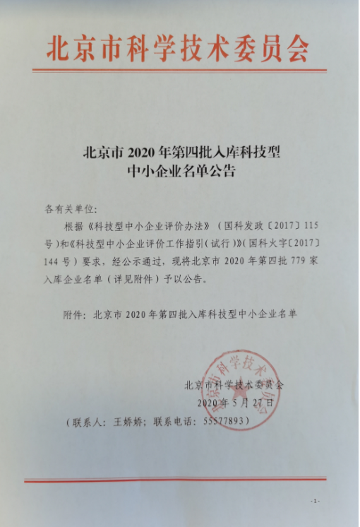 北京市科委根據(jù)《科技型中小企業(yè)評(píng)價(jià)辦法》(國科發(fā)政〔2017〕115號(hào))和《科技型中小企業(yè)評(píng)價(jià)辦法指引(試行)》(國科火字〔2017〕114號(hào))要求,公示通過北京市2020年 “科技型中小企業(yè)”,我公司再次成功入庫北京市全國科技型中小企業(yè)!。這是我公司研究開發(fā)服務(wù)取得的又一喜人成果,是我公司走科技型企業(yè)發(fā)展的一個(gè)巨大突破,是有關(guān)政府部門對(duì)我司研發(fā)和技術(shù)服務(wù)能力的認(rèn)可。