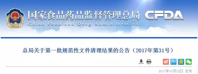 2017年3月22日,國家食品藥品監(jiān)管總局發(fā)布關(guān)于第一批規(guī)范性文件清理結(jié)果的公告(2017年第31號),2013年04月01日至2015年12月31日第一批175個規(guī)范文件繼續(xù)有效,22個規(guī)范文件廢止和宣布失效,其中涉及3個保健食品規(guī)范文件失效。