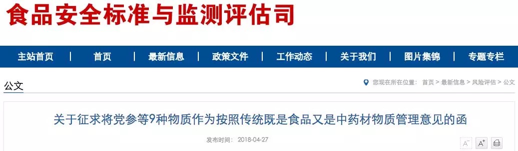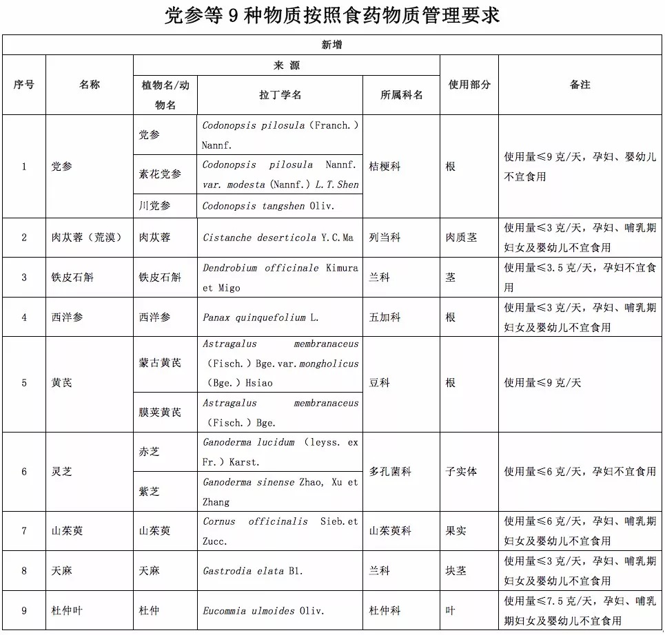 為進(jìn)一步做好按照傳統(tǒng)既是食品又是中藥材物質(zhì)(以下簡(jiǎn)稱食藥物質(zhì))管理工作,按照《食品安全法》規(guī)定,我委正會(huì)同有關(guān)部門和單位研究調(diào)整食藥物質(zhì)目錄,擬在前期工作基礎(chǔ)上,再增補(bǔ)一批物質(zhì)。本輪增補(bǔ)主要結(jié)合我國(guó)傳統(tǒng)飲食習(xí)慣,綜合考慮地方需求,同時(shí)參考相關(guān)國(guó)際管理經(jīng)驗(yàn),擬將黨參、肉蓯蓉、鐵皮石斛、西洋參、黃芪、靈芝、天麻、山茱萸、杜仲葉等9種物質(zhì)按照食藥物質(zhì)管理(附件)。