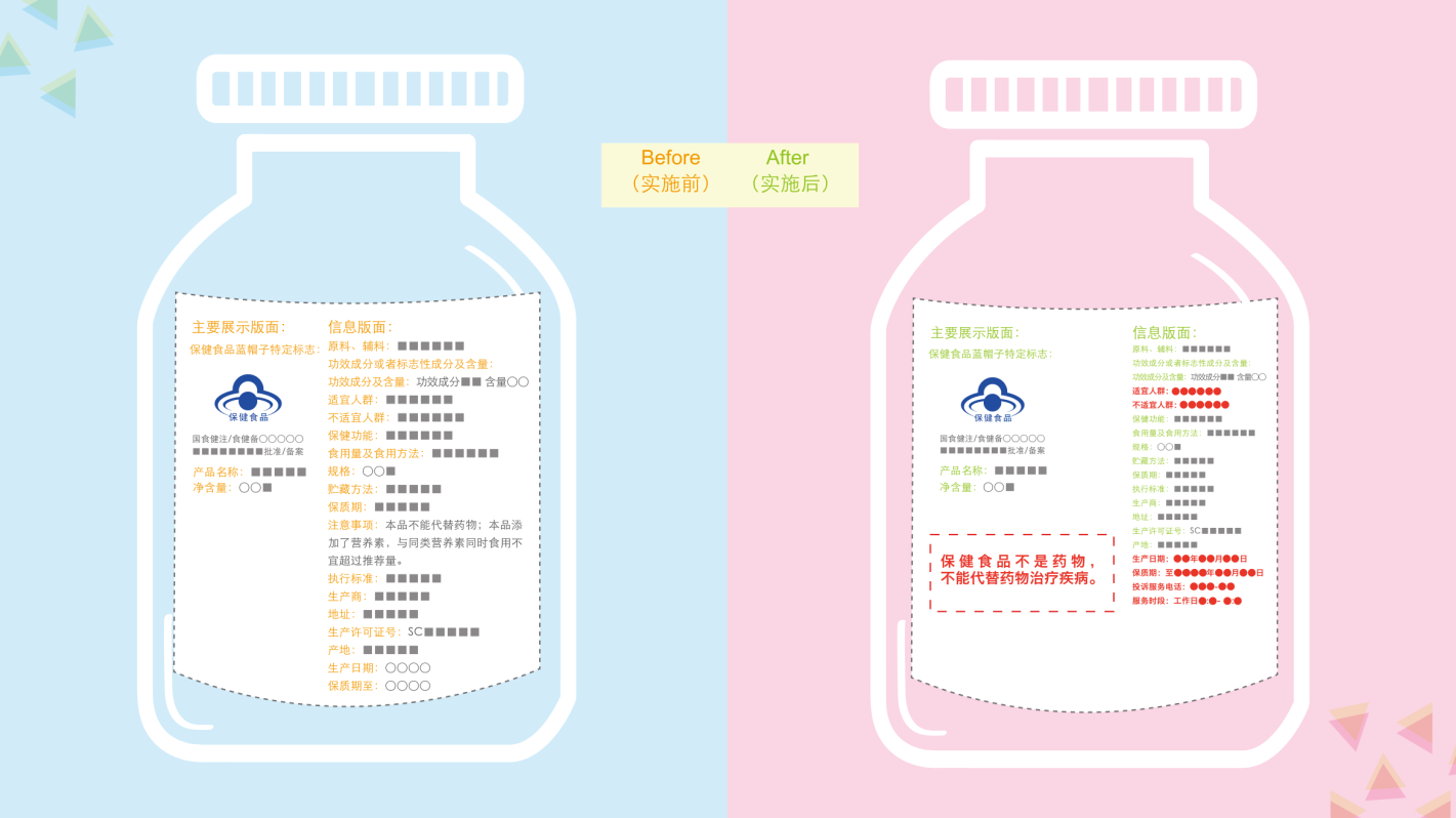 保健食品標(biāo)簽設(shè)置警示用語區(qū)及警示用語。警示用語區(qū)位于最小銷售包裝包裝物(容器)的主要展示版面,所占面積不應(yīng)小于其所在面的20%。警示用語區(qū)內(nèi)文字與警示用語區(qū)背景有明顯色差。警示用語使用黑體字印刷,包括以下內(nèi)容: