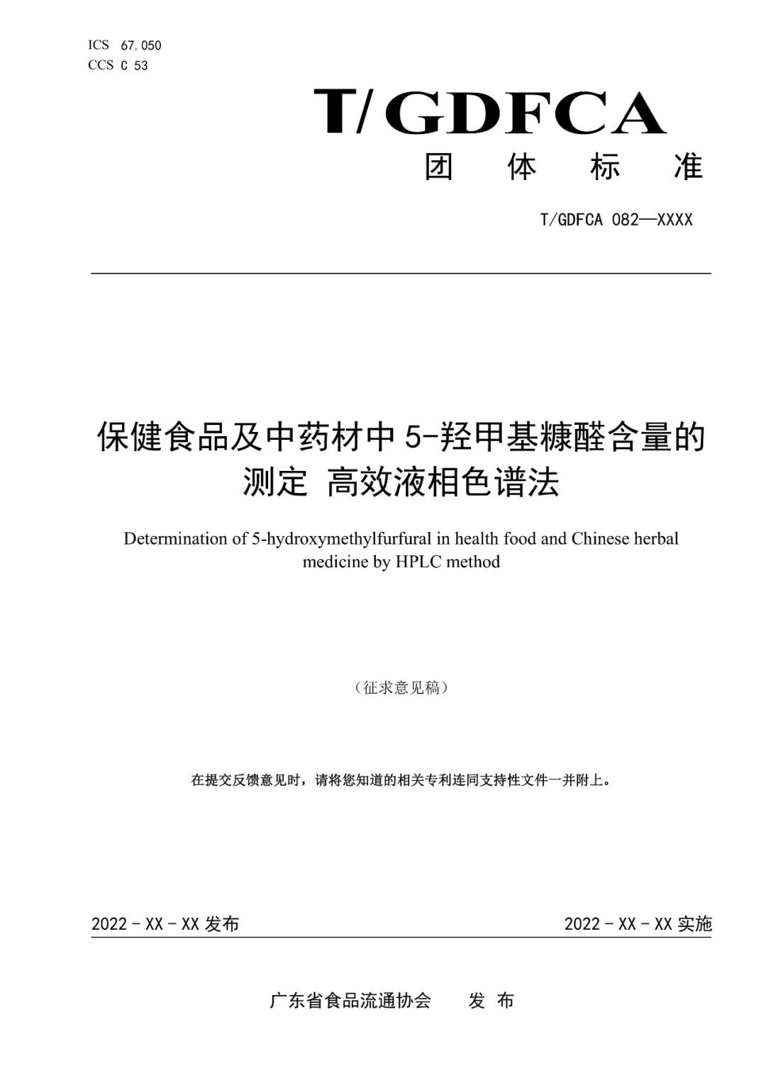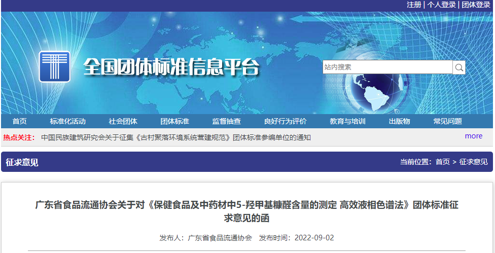 由廣東省食品流通協(xié)會提出的《保健食品及中藥材中5-羥甲基糠醛含量的測定 高效液相色譜法》團(tuán)體標(biāo)準(zhǔn)已完成征求意見稿,為保證團(tuán)體標(biāo)準(zhǔn)的科學(xué)性、實(shí)用性及可操作性,現(xiàn)公開征求意見。