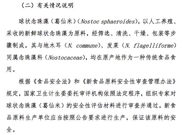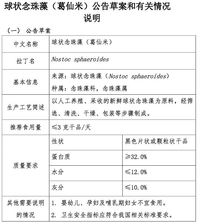 新食品原料球狀念珠藻(葛仙米)公開征求意見