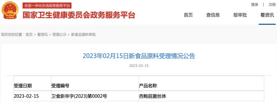 新食品原料 | 國家衛(wèi)健委發(fā)布杏鮑菇菌絲體受理公告