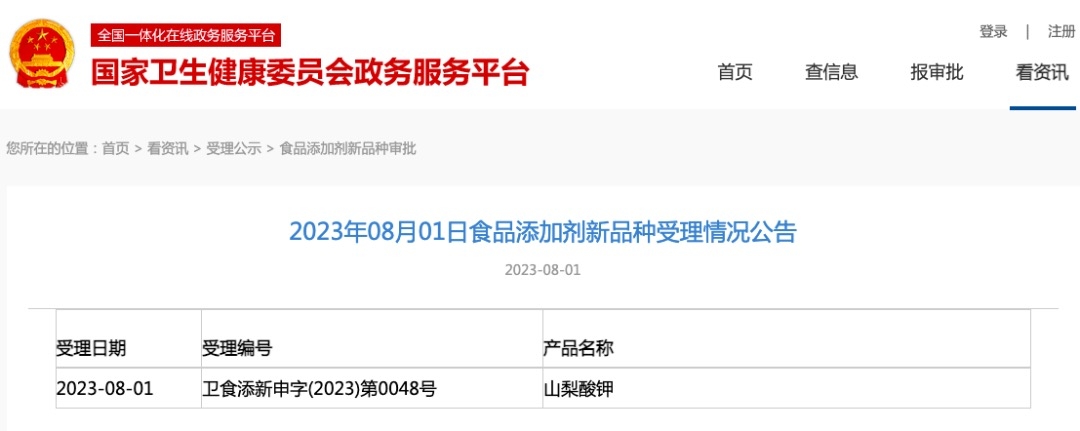 食品添加劑新品種 | 國家衛(wèi)健委發(fā)布山梨酸鉀受理公告