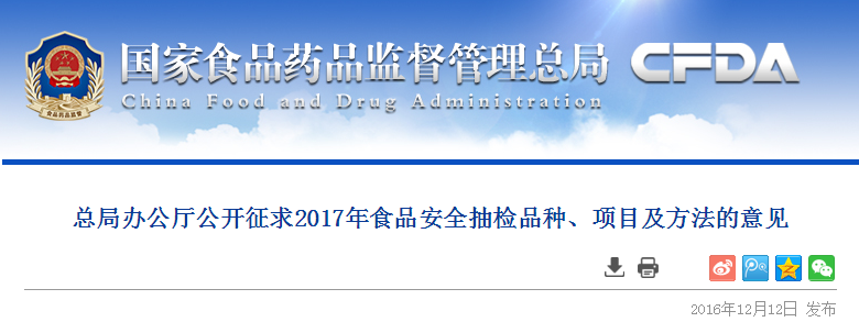 為進(jìn)一步提高食品安全抽樣檢驗工作有效性和靶向性,國家食品藥品監(jiān)督管理總局在征求各省級食品藥品監(jiān)督管理局、食品相關(guān)行業(yè)協(xié)會、技術(shù)機構(gòu)等單位意見的基礎(chǔ)上,組織起草了2017年食品安全抽檢計劃,其中涉及到抽檢品種、檢驗項目、法律法規(guī)依據(jù)和標(biāo)準(zhǔn)、檢測方法等內(nèi)容,現(xiàn)向社會公開征求意見。請將意見于2016年12月23日前通過電子郵件反饋至國家食品藥品監(jiān)督管理總局食品安全監(jiān)管三司。