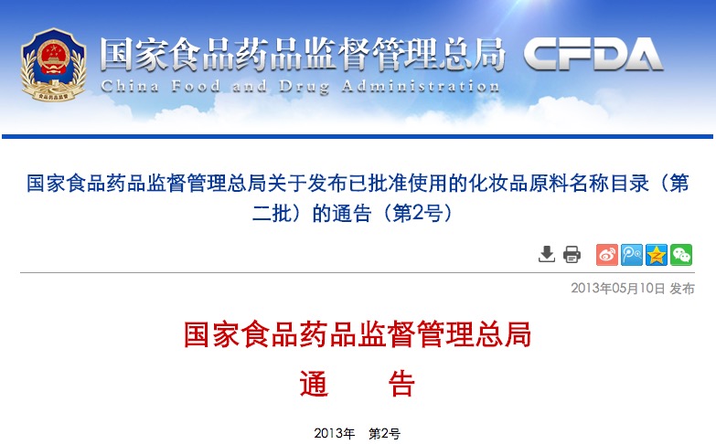 國家食品藥品監(jiān)督管理總局關(guān)于發(fā)布已批準(zhǔn)使用的化妝品原料名稱目錄(第二批)的通告(第2號)