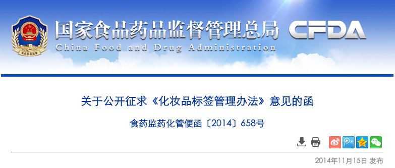 為規(guī)范化妝品標(biāo)簽標(biāo)識(shí)管理,保障消費(fèi)者合法權(quán)益,根據(jù)《中華人民共和國(guó)產(chǎn)品質(zhì)量法》、《化妝品衛(wèi)生監(jiān)督條例》等有關(guān)法律法規(guī),我司組織起草了《化妝品標(biāo)簽管理辦法》(征求意見稿),現(xiàn)公開征求意見,請(qǐng)于2014年11月30日前將有關(guān)意見反饋我司。