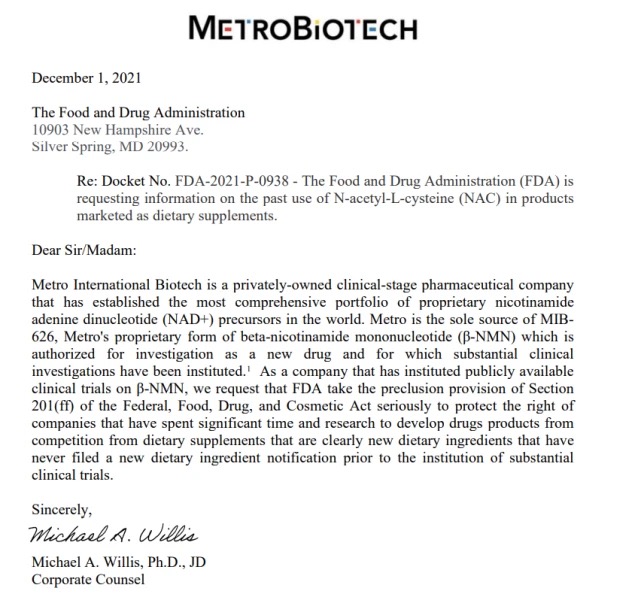 2021年12月1日,制藥公司MetroBiotech就給美國FDA寫信,大致內(nèi)容是公司獨立研發(fā)的MIB-626是一種“NMN衍生分子”,已經(jīng)被授權作為新型藥物進入了臨床階段,希望FDA認真對待聯(lián)邦食品、藥品和化妝品法第201(ff)條的排除條款,下架作為膳食補充劑上市但卻沒申請新NDI的NMN產(chǎn)品,從而保護那些花費時間和資源在開發(fā)藥品的公司權利。
